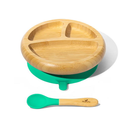 Avanchy Bamboo Sunction Baby Divided Plate + Spoon - Green