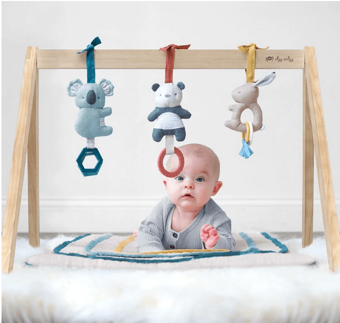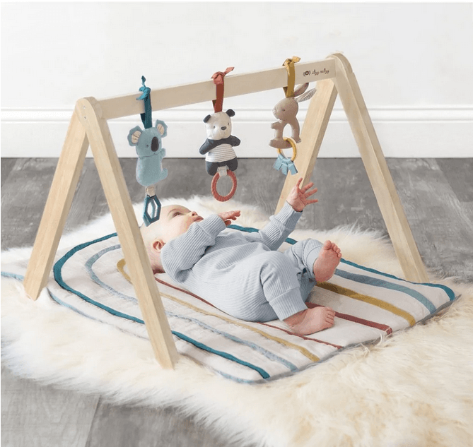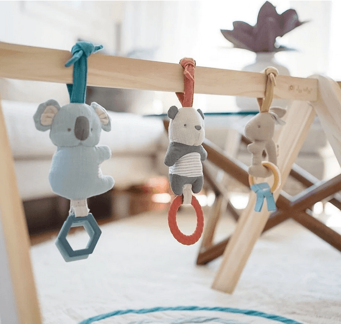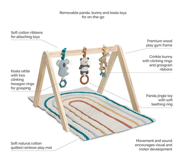 Adventure Awaits! Playtime just got sweeter with the Ritzy Activity Gym™ from our Bitzy Bespoke™ collection. Our premium wooden gym and quilted rainbow play mat create a comfy and modern play area. Made with a natural cotton fabric, our toys and playmat are extra soft against baby’s skin. The adorable bunny, panda, and koala toys entertain with textures and sounds, including a jingle, clinking sounds, and a soft teething ring, perfect for reaching and grasping. Easily remove the sweet characters to take on-the-go for all the travels ahead!