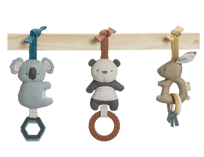 - Koala, panda and bunny toys feature clinking rings, soft teether, ribbons, rattle and jingle sounds. Toys are removable