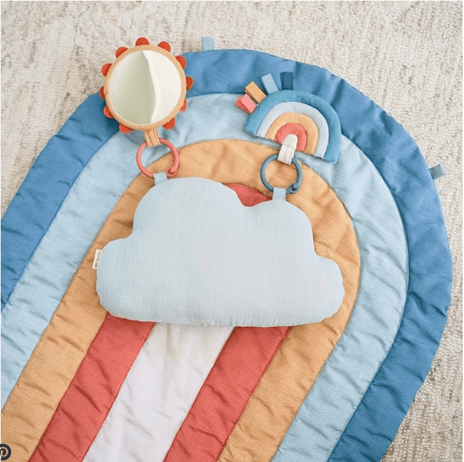 - Rainbow mat and attached tummy time toys make playtime fun and engaging for baby