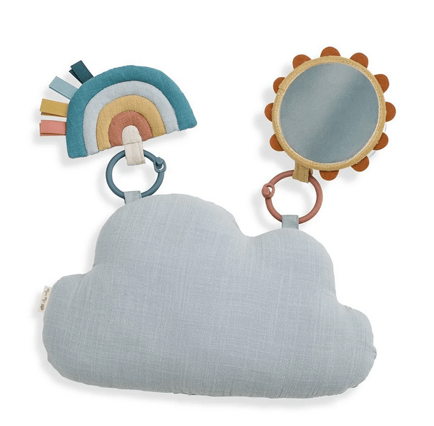 This activity mat includes an airy prop pillow that provides a boost of support helping baby grow stronger by the day, a mirror so your little one can gaze at their reflection and build their visual perception skills, and a plush toy with textured ribbons created to improve motor skills and encourage sensory play. The toys are removable, and the mat folds compactly so you can easily tuck the Ritzy Tummy Time into your diaper bag for adventure and playtime on-the-go!