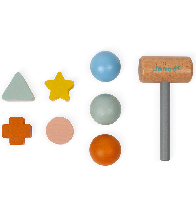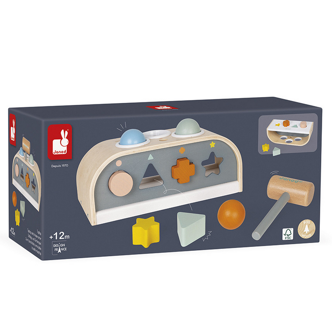 This wooden toddler toy lives up to its name! What could be more fun for little ones aged 12 months and over than picking up the pretty wooden hammer and tapping the balls into the handsome curved box! There are 2 more activities to keep your child entertained, too. Baby will have to recognize the 4 different shapes to put them in the right holes, and the colored-coded shape sorter will help them to learn their colors, too! This game of skill will teach your child agility and coordination while giving them hours of fun. The Sweet Cocoon collection features toys for infants with soft colors and rounded shapes, providing a wide range of fun activities that will keep babies and toddlers entertained for hours! This toddler game is made of wood from sustainably managed forests.