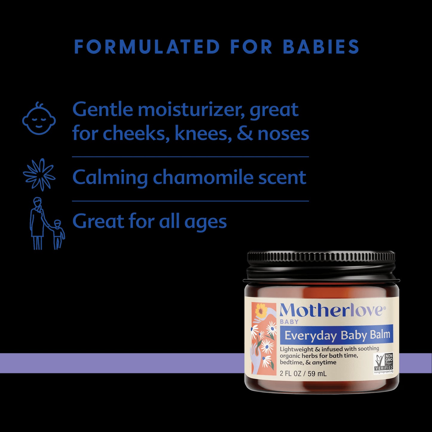 Motherlove’s Everyday Baby Balm is Non-GMO Project Verified, Certified Cruelty Free by Leaping Bunny, and made with only USDA Certified herbs. Does not contain petroleum or petroleum by-products, lanolin, parabens, phthalates, or synthetic fillers.