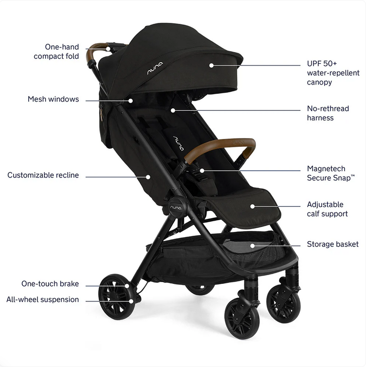 At the touch of a button on the push bar, the Nuna TRVL stroller self-folds into a super-compact, free-standing package - giving you the convenience and mobility you need to discover the world in style. A one-hand compact fold keeps your transitions simple and struggle-free.