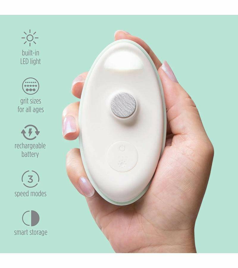 The Olababy rechargeable nail trimmer features gentle rotating filing pads, preventing potential damage to surrounding skin, cuticles, and nail beds.