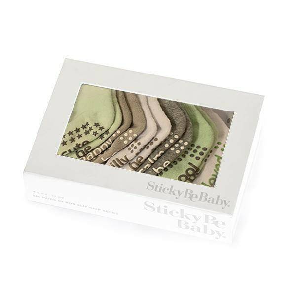 Available in a variety of colors and cute messages.6 pairs of baby non slip grip socks in a Sticky Be gift box
