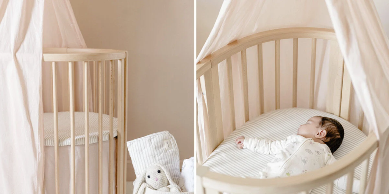 Easy assembly onto drape rod with extra attachment to the crib bottom with ribbons