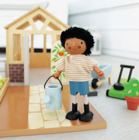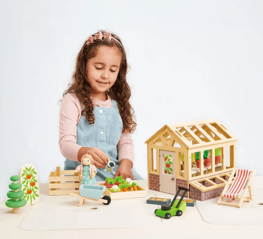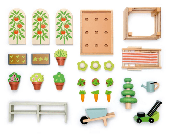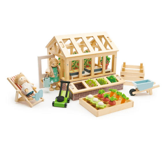 Wanting an extension for your dolls house? For children who love nature and playing in the garden, this set is ideal for encouraging green fingers. A traditional plywood greenhouse with base has an opening door, and 2 removable roof panels. It can be filled with 2 seed trays, a planting bench, 4 pot plants, and 3 tomato shrubs. We have included a cold frame for nurturing seeds, a raised bed with 9 vegetables, a compost bin, a lawnmower, a watering can, a topiary tree, a wheelbarrow, and last but not least, a deck chair for your dolls to enjoy the fruits of their labor.