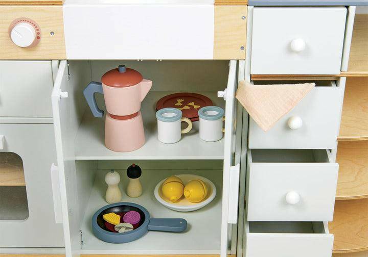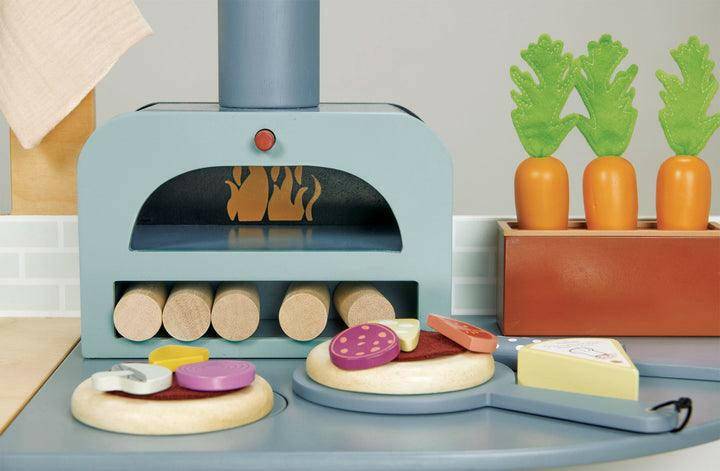 Cook up a storm in our magnificent La Fiamma Kitchen! A two-part kitchen - sink and cooker with back board, and a storage unit with pizza oven. Unit includes oven and grill with 4 clacking buttons, and double door storage unit under the sink. Complete with lots of accessories including a pizza oven with 5 wooden logs, pizza plate, two pizza bases, two felt toppings, egg, onion, cheese, mushroom, pineapple, pepperoni, tomato, parmesan and grater, frying pan, two wooden utensils in a pot, white bowl with 3 segmented lemons, 3 carrots in a planter, traditional Italian coffee pot, two cups, two decorated plates, 3 magnetic knives, salt and pepper grinders, muslin pot holder.