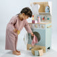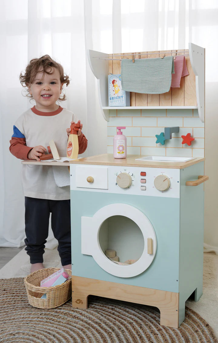 An all encompassing laundry unit where you can wash, dry, iron and fold away all your dolly laundry! Use the pretty wicker basket to collect the dirty laundry, pop it all in the washing machine and add 2 tablets into the top drawer. Press buttons to start/stop, and select a cycle and spin speed on 2 clacking knobs. Select temperature for the drying cycle and watch as the clothes get tumbled about! A sink area to hand wash and a variety of 3 wooden and 2 cardboard cleaning products to assist a bright wash day! Hang the clothes on one of 3 lines with wooden pegs, and finally give it all a good press on the fold up ironing board on the side. Good for pretend play. Good for social and language skills.