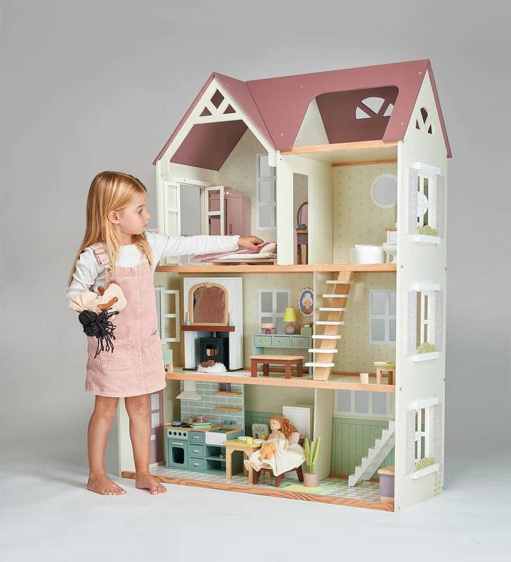 A large open-fronted wooden dolls house scaled for 9.84” / 25cm dolls. Beautiful contemporary soft colours and detailed illustrations make this house unique and premium. The gabled roof and attic space, opening shutters and front door with windows at the back panel allow light to flood into the spacious interior. Access to a balcony on the second floor gives extra interest and space to play. Furniture included.