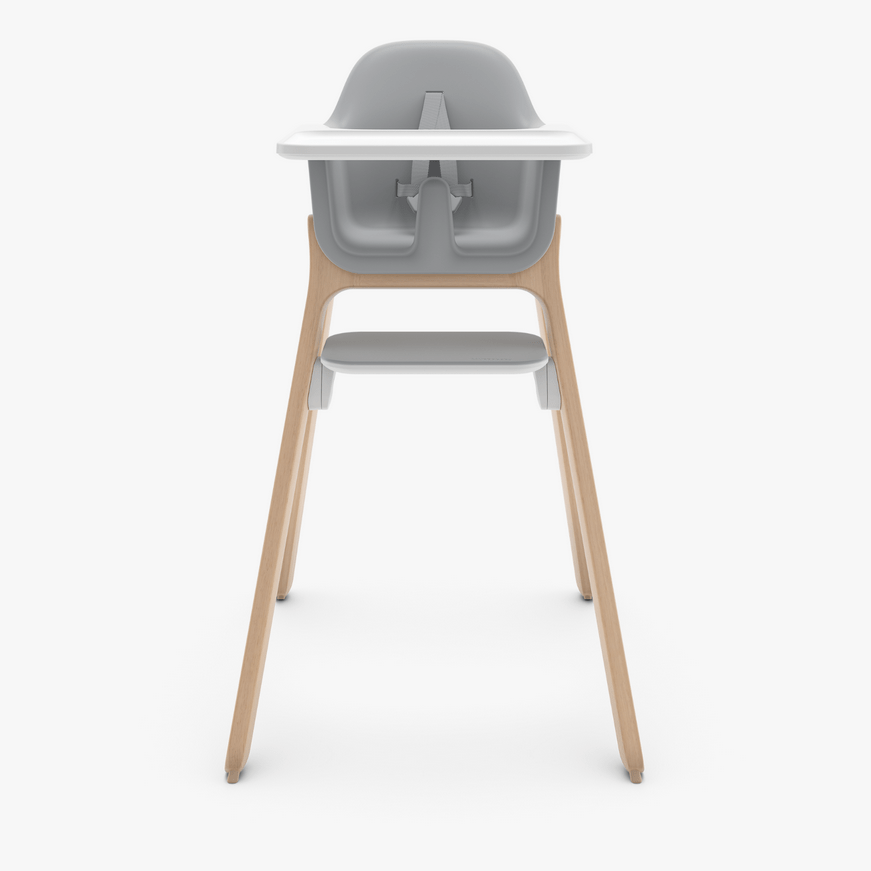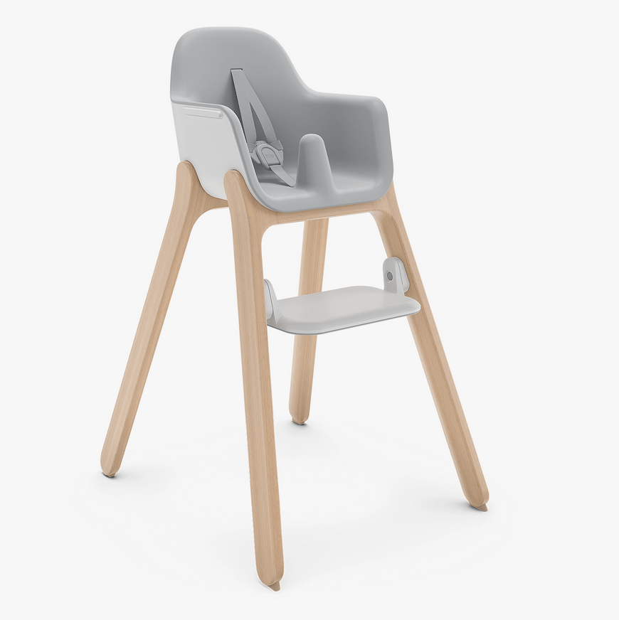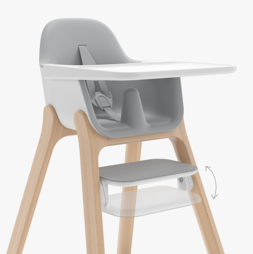 The Ciro High Chair has a sleek design, unique harness that adjusts with the push of a button (in the back) and an adjustable tray that’s slightly higher, allowing it to extend over the dining table so baby is closer. The dual-position rotating footrest starts at a higher position and then flips over to a lower position as they grow. The seam-free seat and food-friendly harness also make it easy to clean.